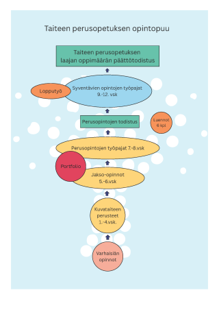 Opinnoissa tutustutaan nykytaiteen toimintatapoihin, pohditaan taiteen kulttuurisidonnaisuutta sekä käsitellään taiteen historiallisia, sosiaalisia ja yhteiskunnallisia merkityksiä. Opetuksessa hyödynnetään tilaisuuksia osallistua paikalliseen taidetoimintaan. Opinnoissa tutustutaan mahdollisuuksien mukaan taiteen instituutioihin, muihin kulttuurikohteisiin, ajankohtaisiin taiteen ilmiöihin ja visuaalisten alojen ammattilaisten työhön.