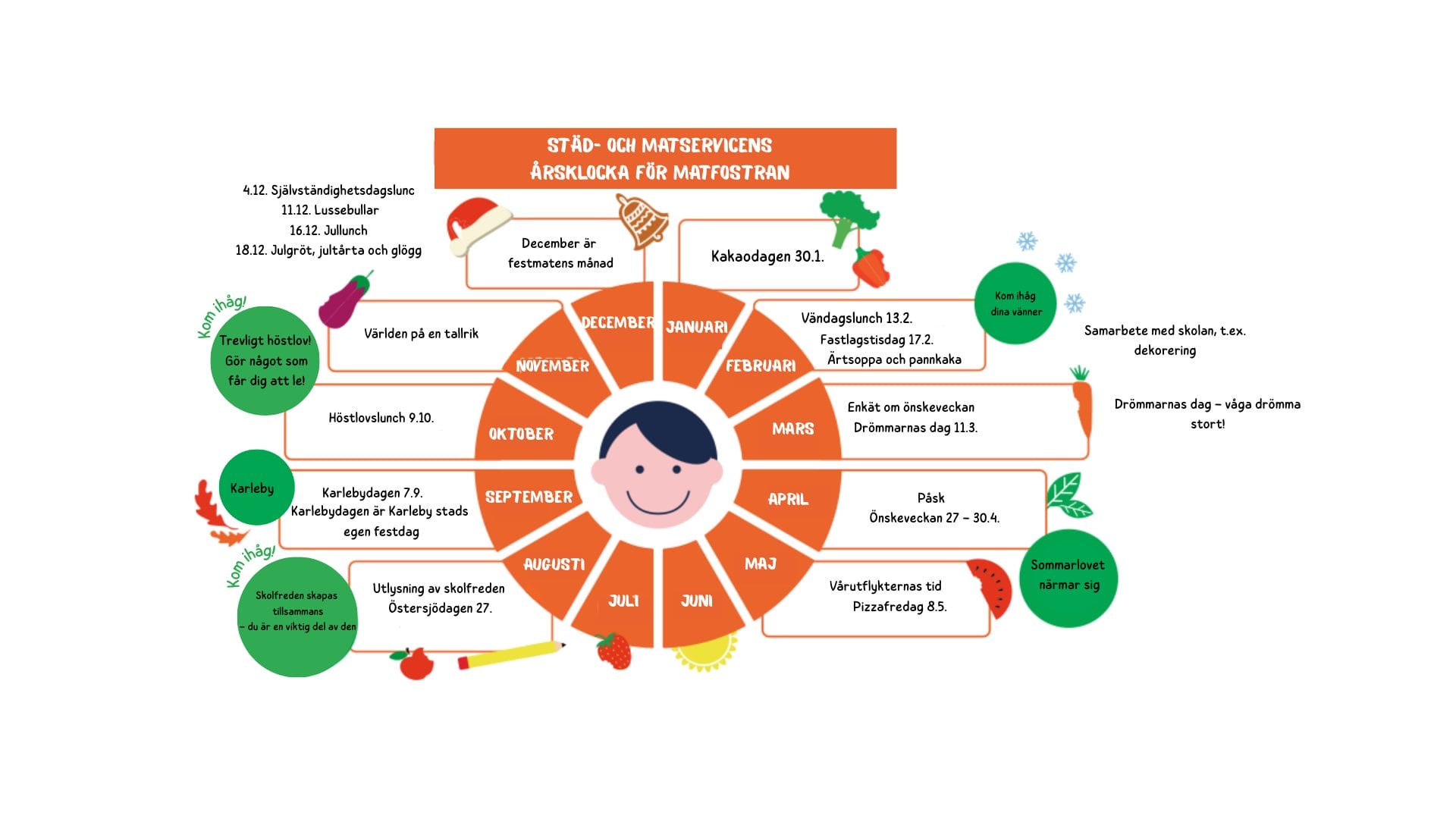 Våra matlistor motsvarar de nyaste näringsrekommendationerna. Vi utnyttjar en fem veckors roterande matlista. Variation i bespisningen fås med olika temadagar och -veckor samt högtider med tillhörande mattraditioner.