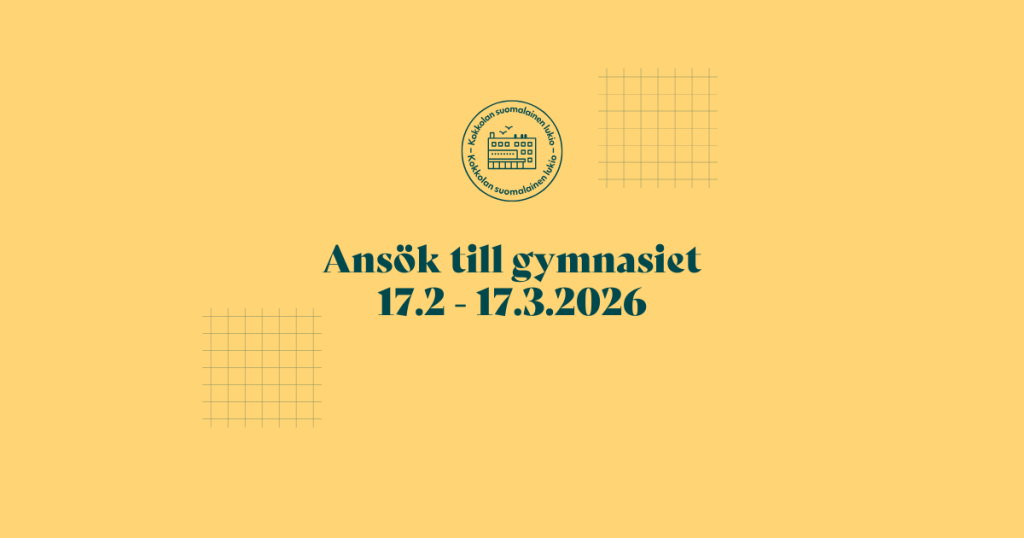 Du kan söka till Kokkolan suomalainen lukio i den gemensamma ansökan på adressen www.opintopolku.fi. Ansökningen sker på våren i den gemensamma ansökan för yrkesutbildning och gymnasieutbildning. Ansökningstiden för den gemensamma ansökningen till studier efter grundskolan våren 2026 är 17.2–17.3.2026.