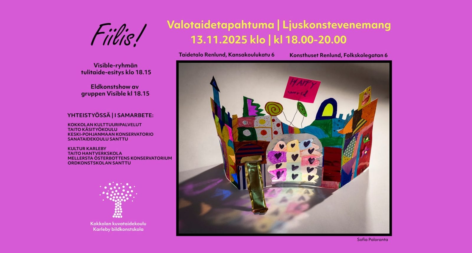 Kokkolan kuvataidekoulu järjestää kaikille avoimen valotaidetapahtuman kuvataidekoulun pihalla ja sisätiloissa (Kansakoulukatu 6B) torstaina 13.11.2025 klo 18:00-20:00. Olette kaikki lämpimästi tervetulleita tapahtumaan!